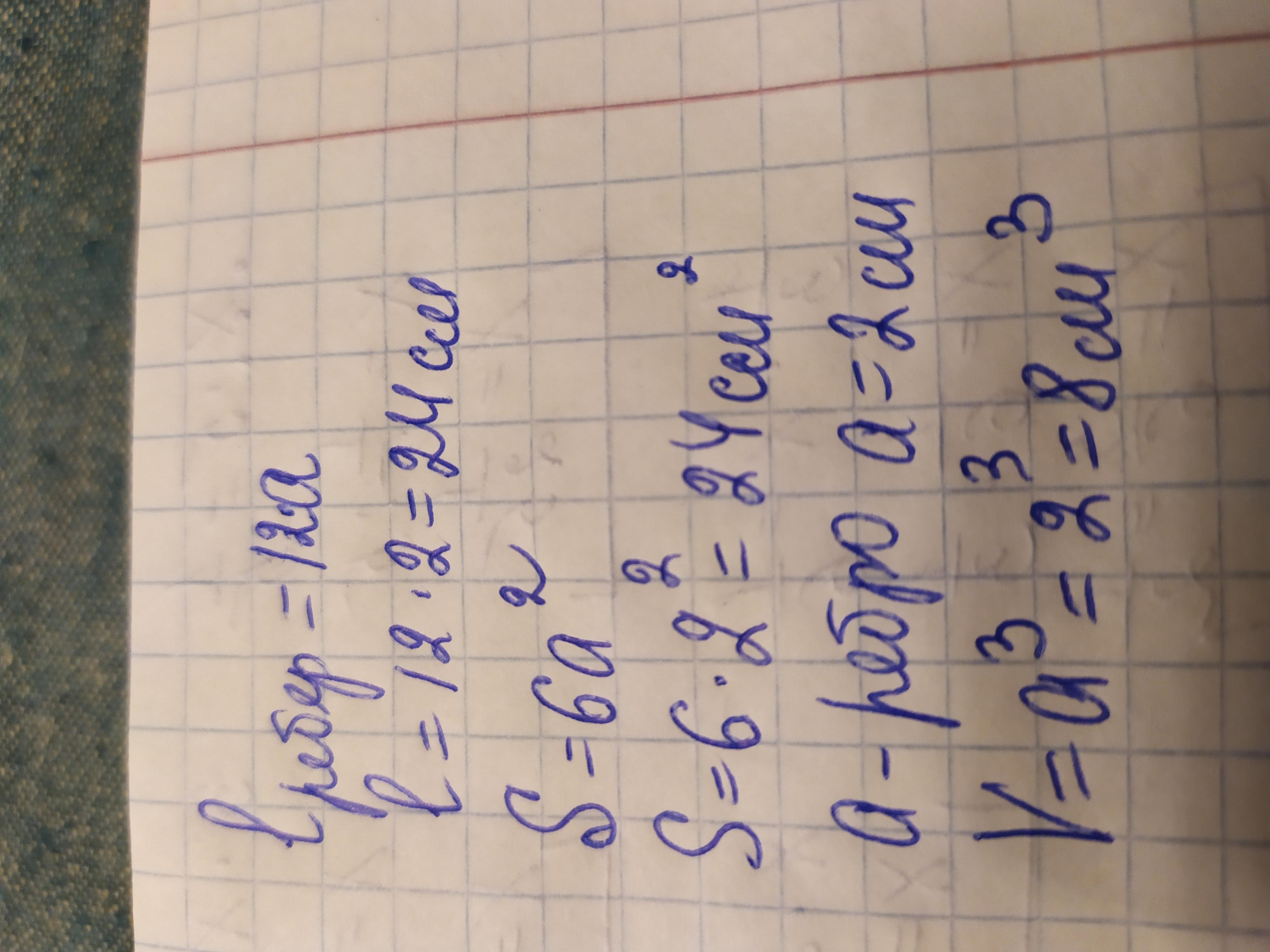 Ответ: длина всех рёбер 12*2=24 см, объём 2*2*2=8 см^3, площадь поверхности 6*2*2=6*4=24 см^2.