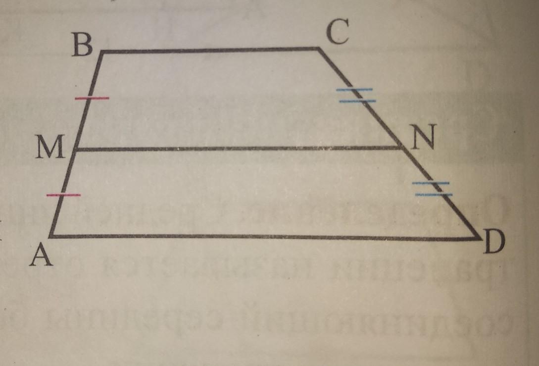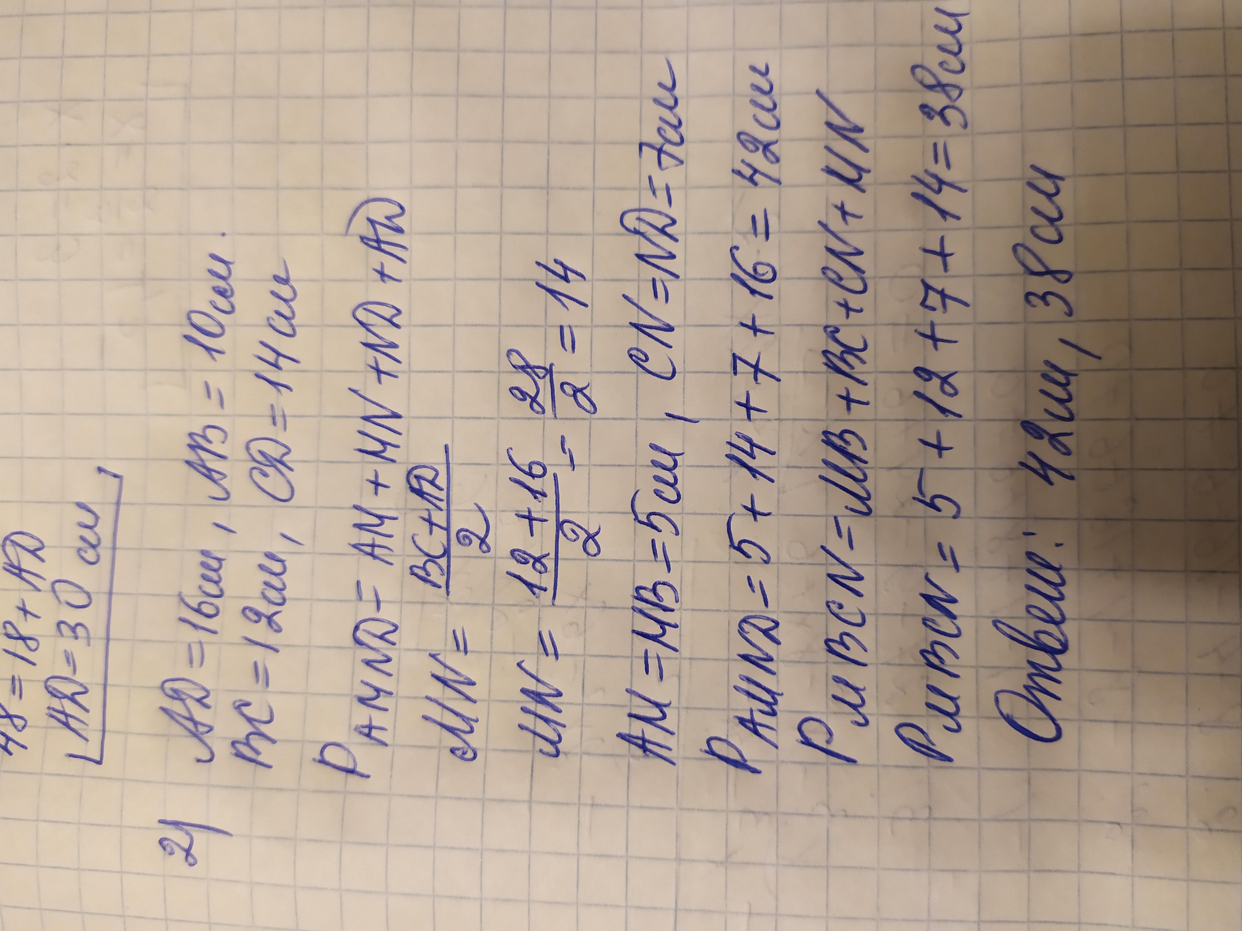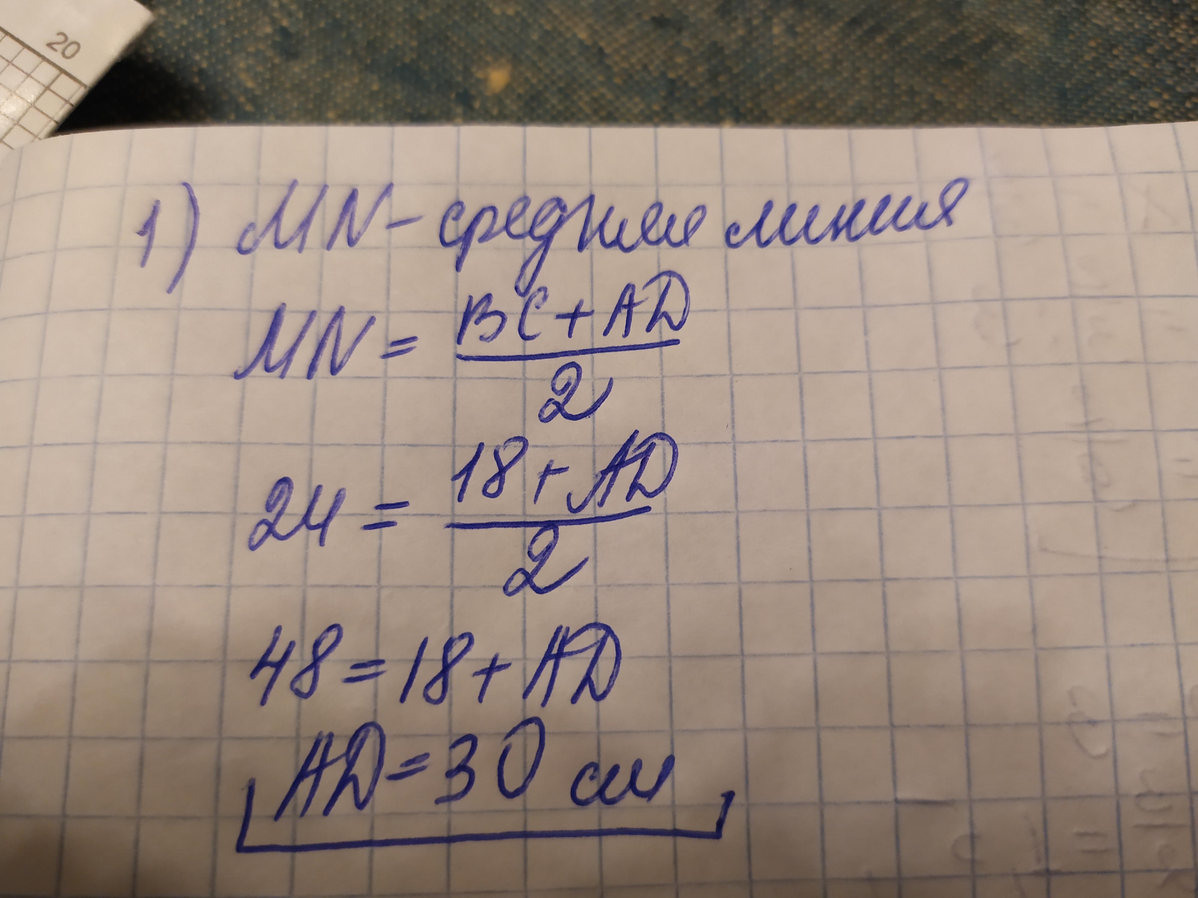 MN-средняя линия трапеции ABCD. Найдите: а)длину основания AD, если BC=18 см, MN=24см; b) периметры трапеций AMND и MBCN, если AD=16 см, AB=10 см, BC=12 см, CD=14 см.