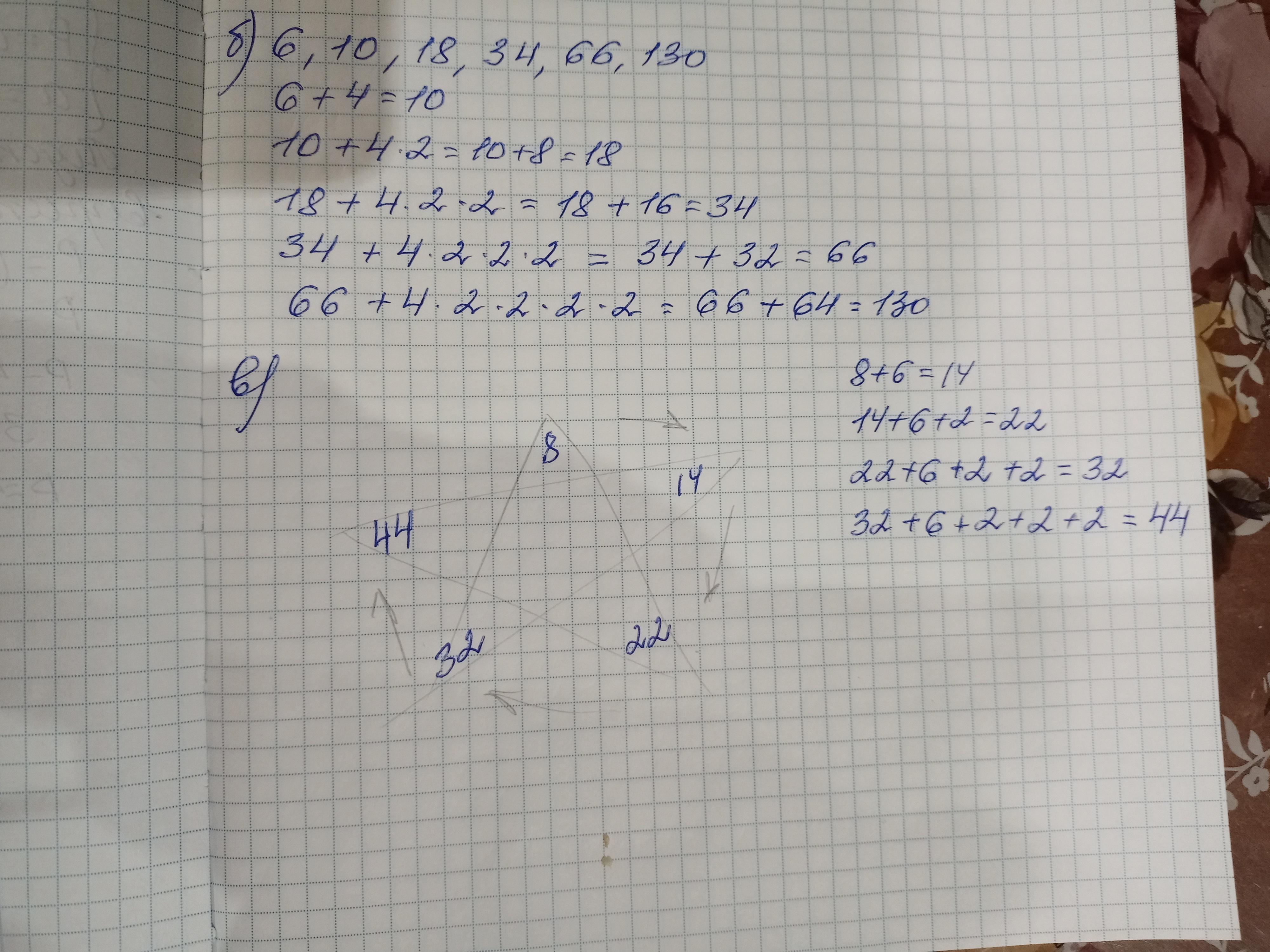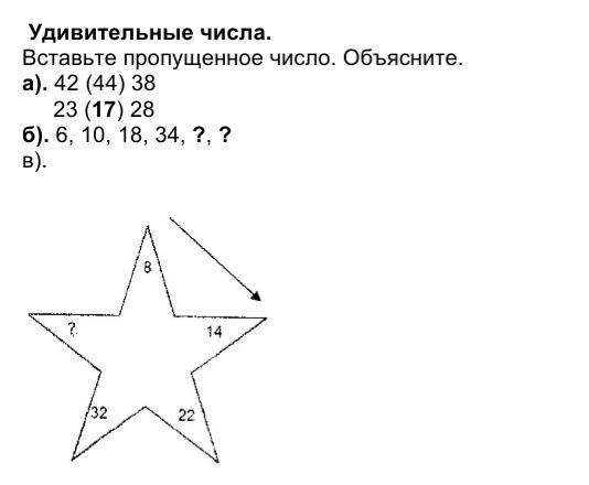 СРОЧНО!!! Удивительные числа. Вставьте пропущенное число. ОБЪЯСНИТЕ . а). 42 (44) 38 23 ( ? ) 28 б). 6, 10, 18, 34, ?, ? в).