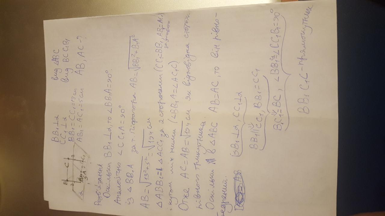 ДАЮ 100 БАЛЛОВ! До площини проведено дві перпендикулярні прямі, які перетинають площину в точках B1 і C1. На цих прямих відкладені відрізки BB1 = CC1 = 13 см. На площині відстані AB1 = AC1 = 5 см. Визнач вид трикутника ABC, вид чотирикутника BCC1B1 і обчисли відстані AB і AC.