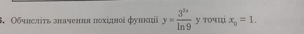 y=\frac{3^{2x}}{ln9};\\y'=\frac{3^{2x}ln3*2}{ln9}=\frac{3^{2x}ln9}{ln9}=3^{2x};\\y'(x_0)= 3^{2*1}=9.