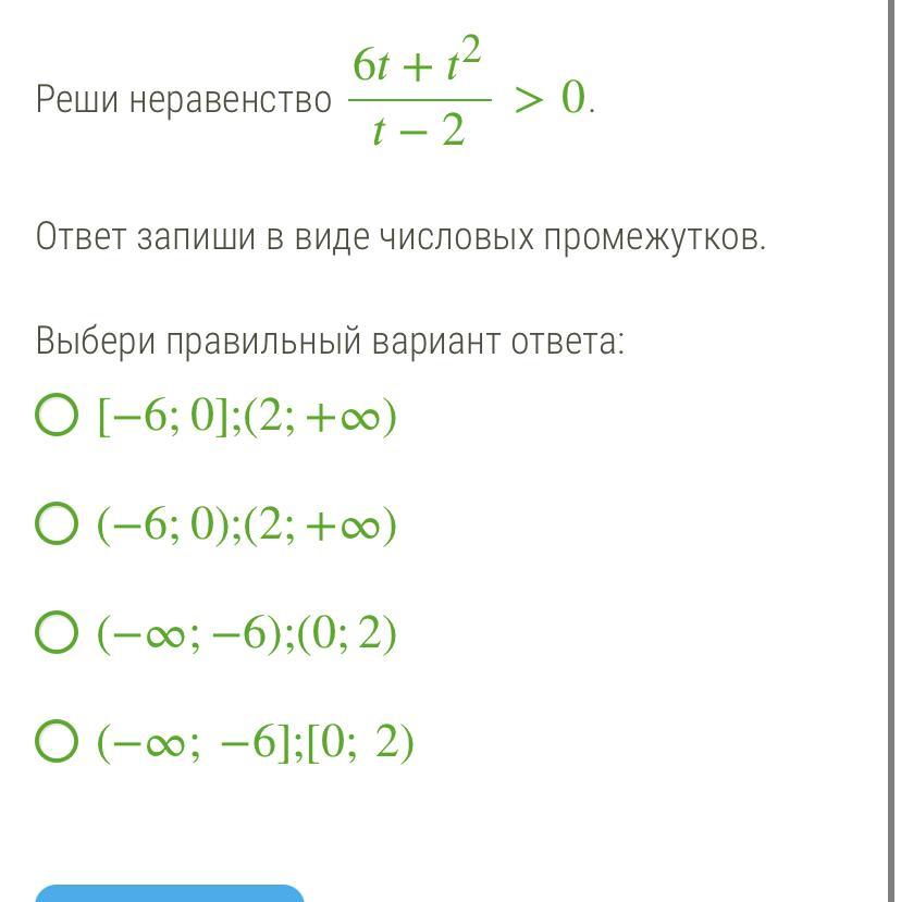 Теперь чертим ось t, выделяем три выколотые точки 0, 2 и -6, подставляем любое число из каждого интервала : нам нужно, чтоб при подставленном значении t дробь была положительной, так как у нас дробь > 0