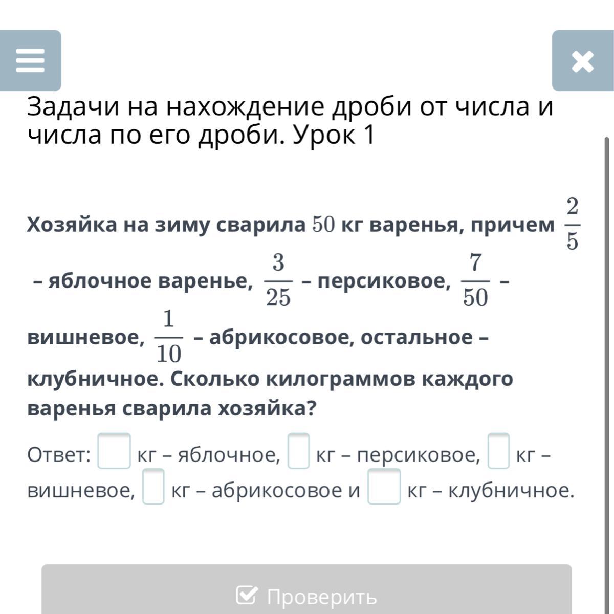 1/10– абрикосовое, остальное – клубничное. Сколько килограммов каждого варенья сварила хозяйка?