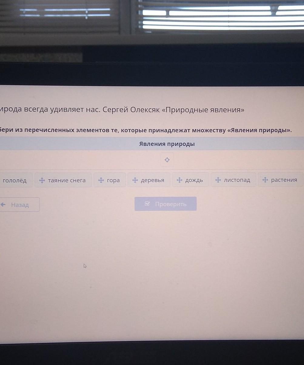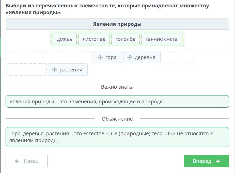 Выбери из перечисленных элементов те, которые принадлежат множеству «Явления природы».