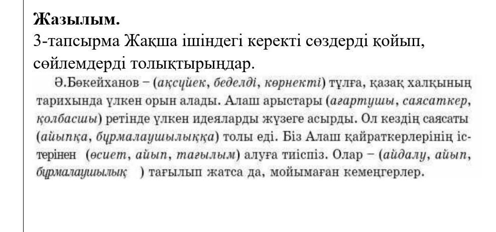 3-тапсырма Жақша ішіндегі керекті сөздерді қойып, сөйлемдерді толықтырыңдар.