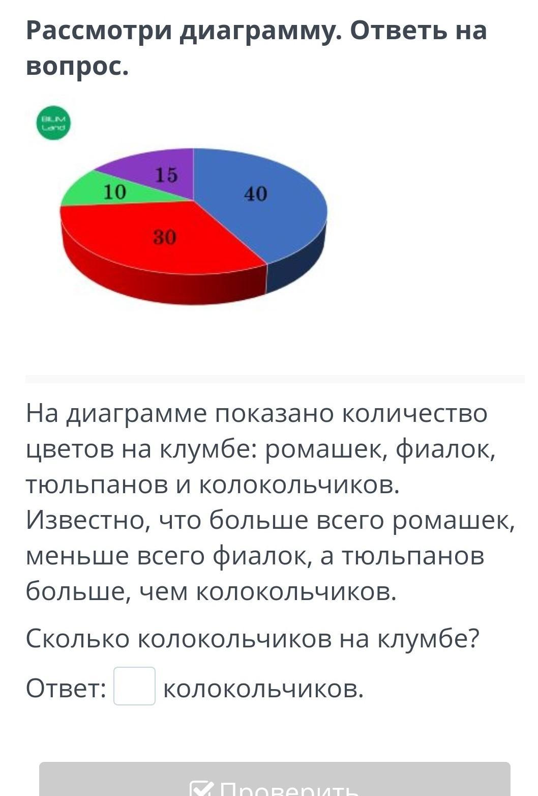 На диаграмме показано количество цветов на клумбе: ромашек, фиалок, тюльпанов и колокольчиков. Известно, что больше всего ромашек, меньше всего фиалок, а тюльпанов больше, чем колокольчиков.