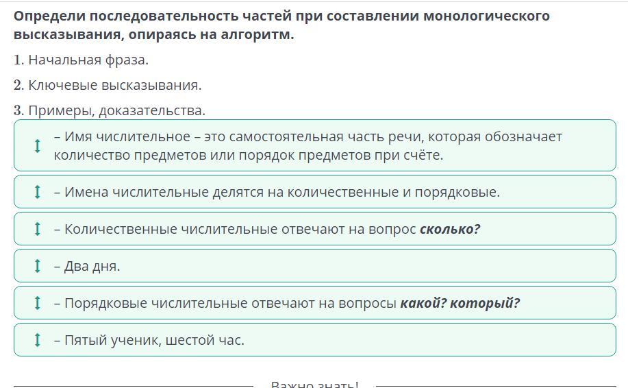 Определи последовательность частей при составлении монологического высказывания, опираясь на алгоритм.