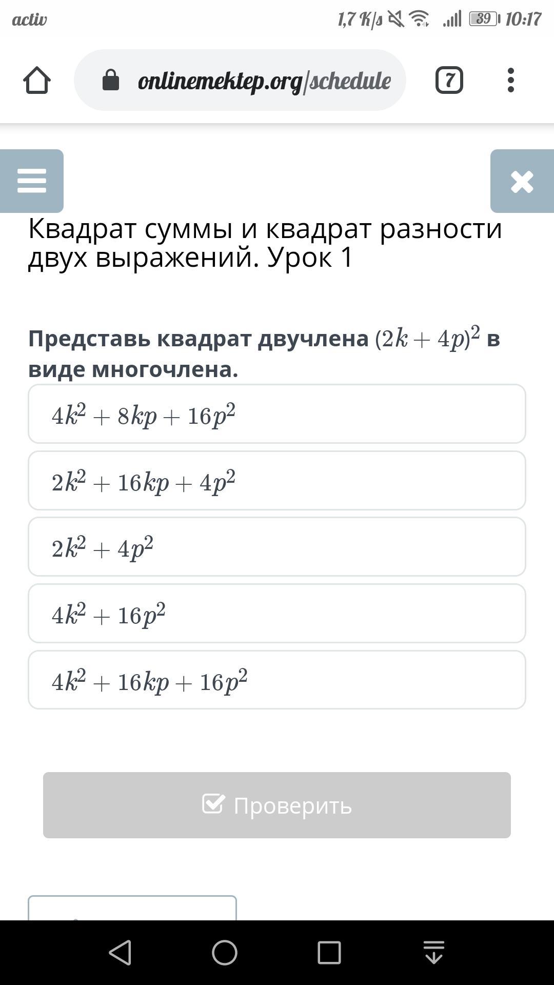 Представь квадрат двучлена: (2k+4p) ² в виде многочлена