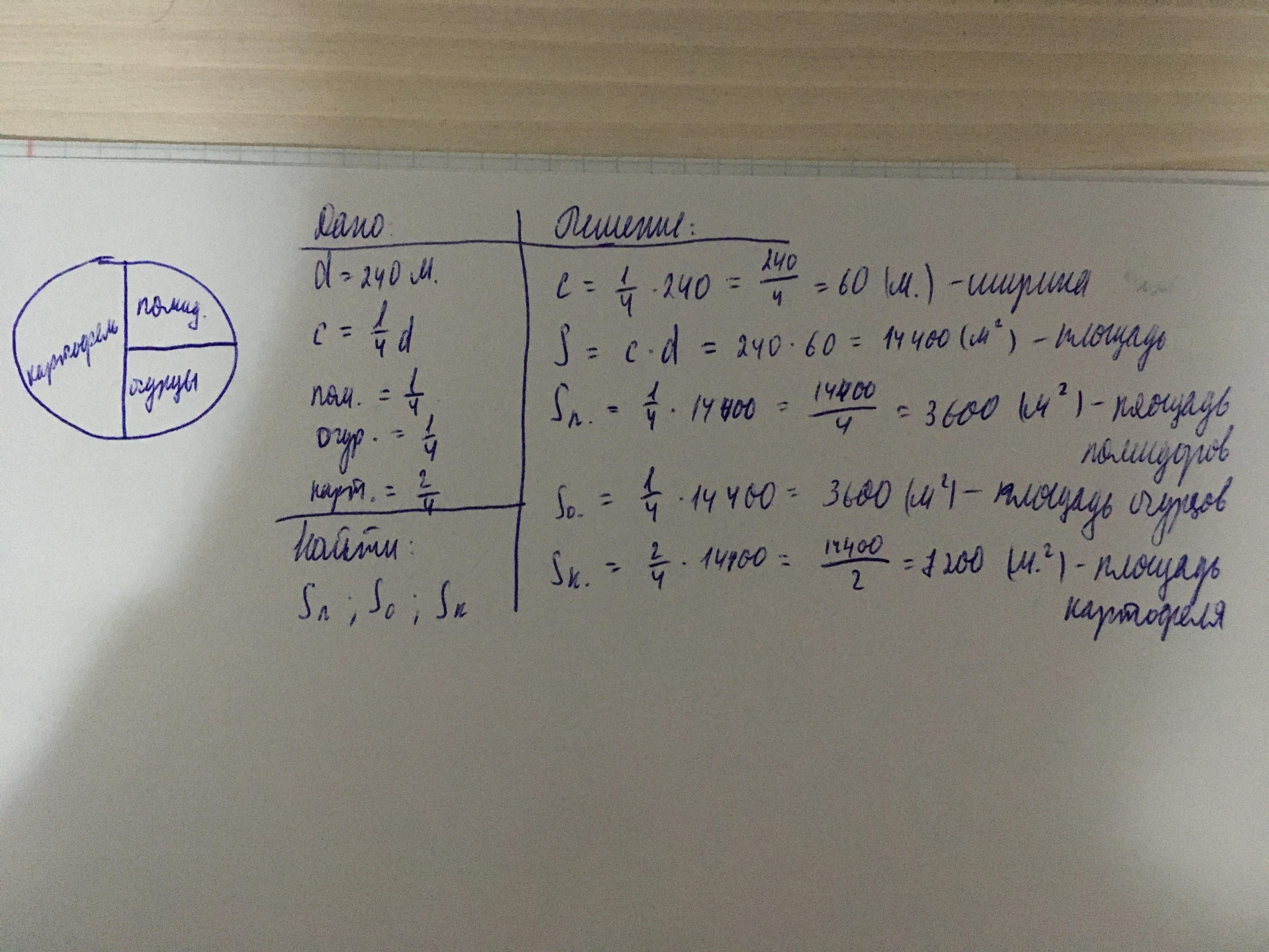 Диаграмму чертила от руки, но вроде понятно. d - длина огорода, с - ширина огорода. Можно поменять d на а, с на b, если так удобнее. S - площадь всего огорода, Sп. - площадь занимаемая помидорами, соответственно, So. - огурцами, Sк. - картофелем. Если разрешают, задание вообще без дано можно записать. Только решение.