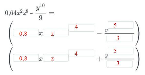 0,64·x²·z⁸ – y¹⁰/9 = (0,8·x·z⁴)² – (y⁵/3)² = (0,8·x·z⁴ – y⁵/3)·(0,8·x·z⁴ + y⁵/3).