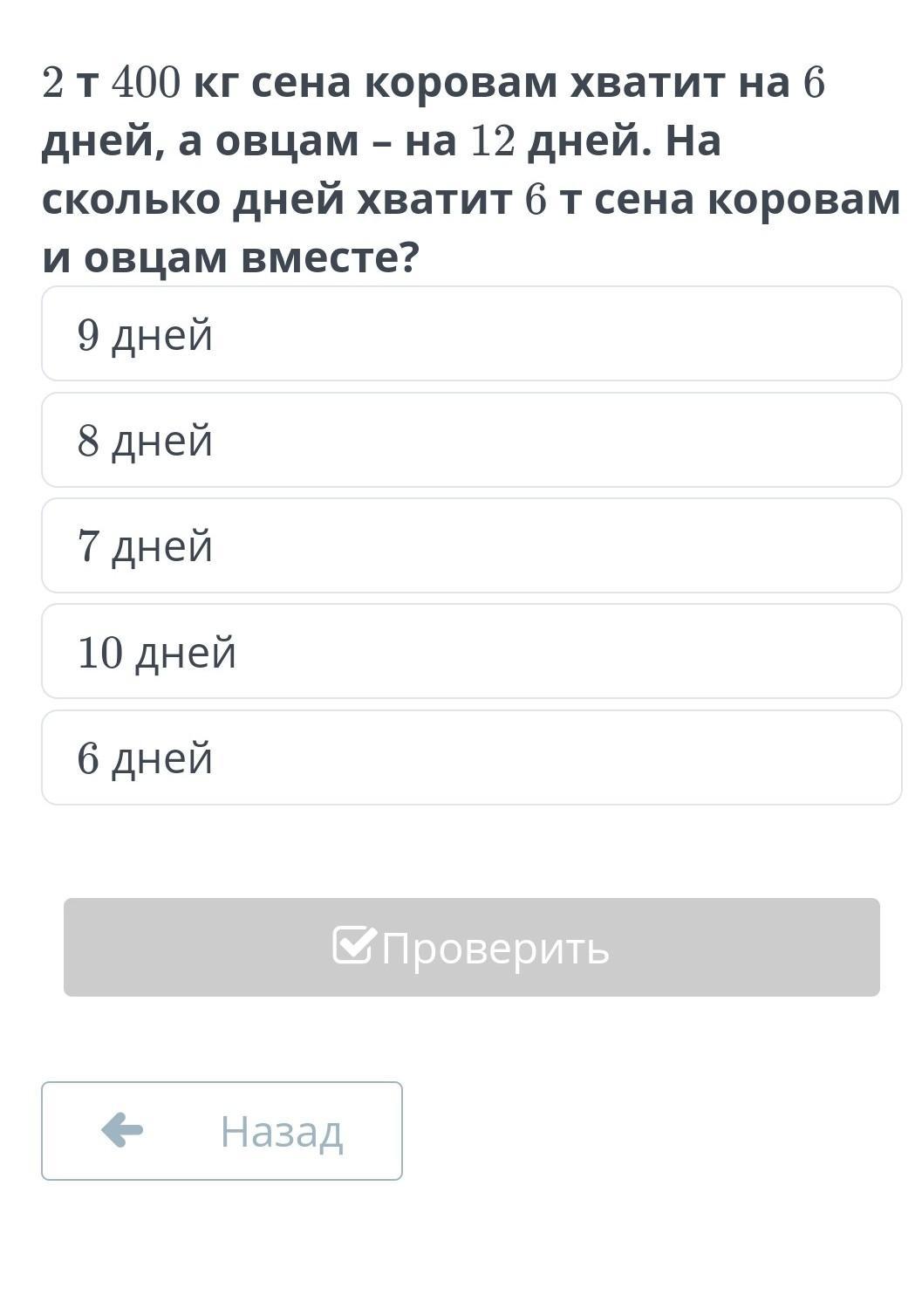 2 т 400 кг сена коровам хватит на 6 дней, а овцам – на 12 дней. На сколько дней хватит 6 т сена коровам и овцам вместе?
