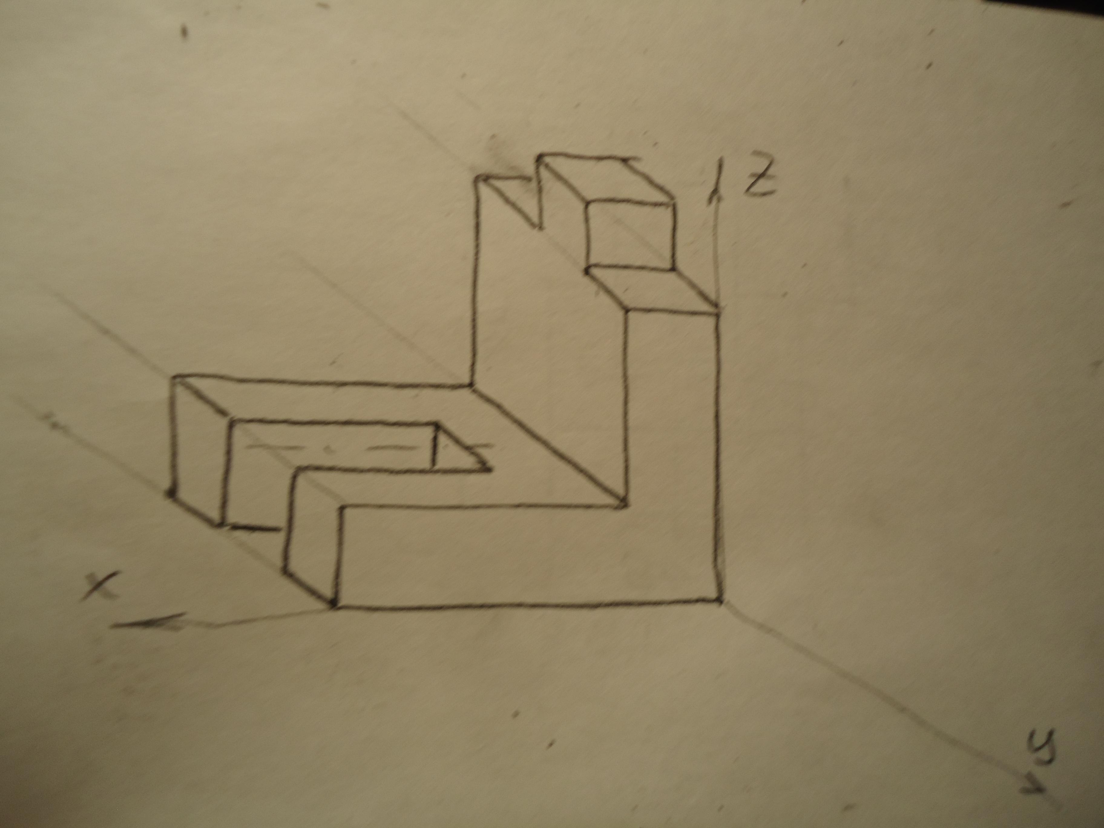 Я выбрала диметрию, т.к. в ней легче построения. Построение выполнялось от руки с сохранением пропорций на глаз. Единственное надо помнить, что по оси Y и параллельно ей отмерять надо размеры в два раза меньше действительных размеров детали.