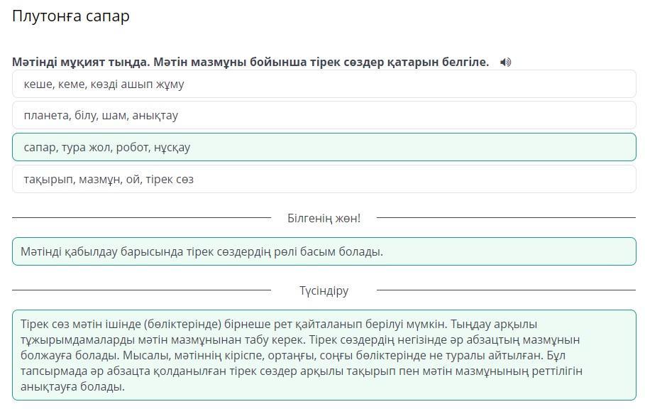 Мәтінді мұқият тыңда. Мәтін мазмұны бойынша тірек сөздер қатарын белгіле.