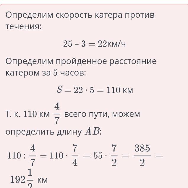 Катер от точки A плыл 5 часов со скоростью 25км/ч против течения, что равно 4/7