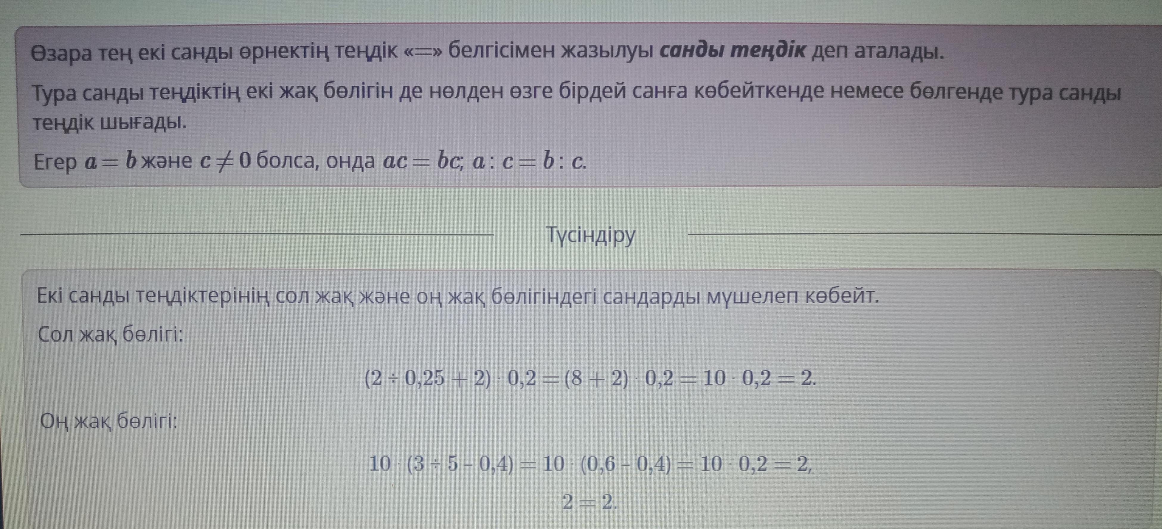 Выполни почленное умножение верных числовых равенств 2 : 0,25 + 2 = 10 и 0,2 = 3 : 5 – 0,4.