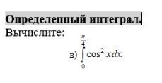 \int\limits^{\frac{\pi}{4}}_0\, cos^2x\, dx=\int\limits^{\frac{\pi}{4}}_0\, \dfrac{1+cos2x}{2}\, dx=\int\limits^{\frac{\pi}{4}}_0\, \Big(\dfrac{1}{2}+\dfrac{1}{2}\cdot cos2x\Big)\, dx=\\\\\\=\Big(\dfrac{1}{2}\cdot x+\dfrac{1}{2}\cdot \dfrac{1}{2}\, sin2x\Big)\Big|_0^{\frac{\pi}{4}}=\dfrac{1}{2}\cdot \dfrac{\pi}{4}+\dfrac{1}{4}\cdot (sin\dfrac{\pi}{2}-sin0)=\dfrac{\pi}{8}+\dfrac{1}{4}=\dfrac{1}{4}\cdot \Big(\dfrac{\pi}{2}+1\Big)