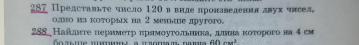 СРОЧНО!! 287.Представьте число 120 в виде произведения двух чисел, одно из которых на 2 меньше другого