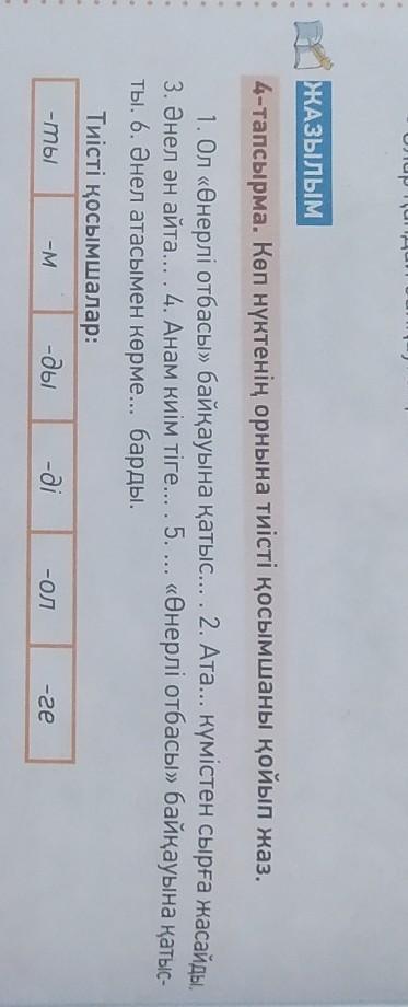1. Ол өнерлі отбасы байқауына қатысты. 2. Атам күмістен сырға жасайды. 3. Әнел ән айтады. 4. Анам киім тігеді. 5. Ол Өнерлі отбасы байқауына қатысты. 6. Әнел атасымен көрмеге барды.
