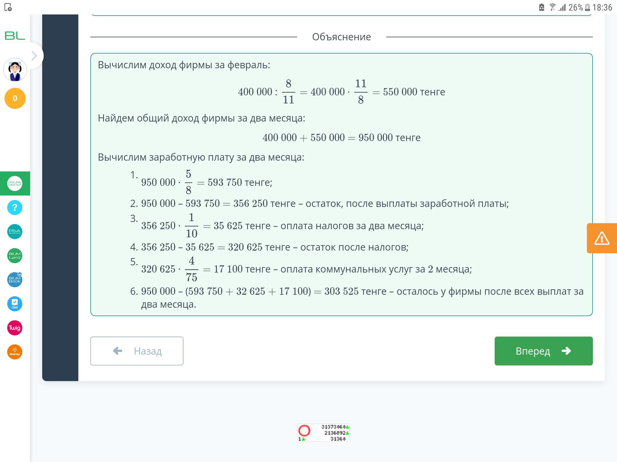 Доход фирмы в марте составил 400 000 тенге что состовляет 8/11 превыдущего месяца Из этой суммы 5/8 идет на выплату заработной платы 1/10 остатка на оплату налогов а 4/75 нового остатка на оплату коммунальных услуг Сколько денег осталось у вирмы за два месяца после выплат?