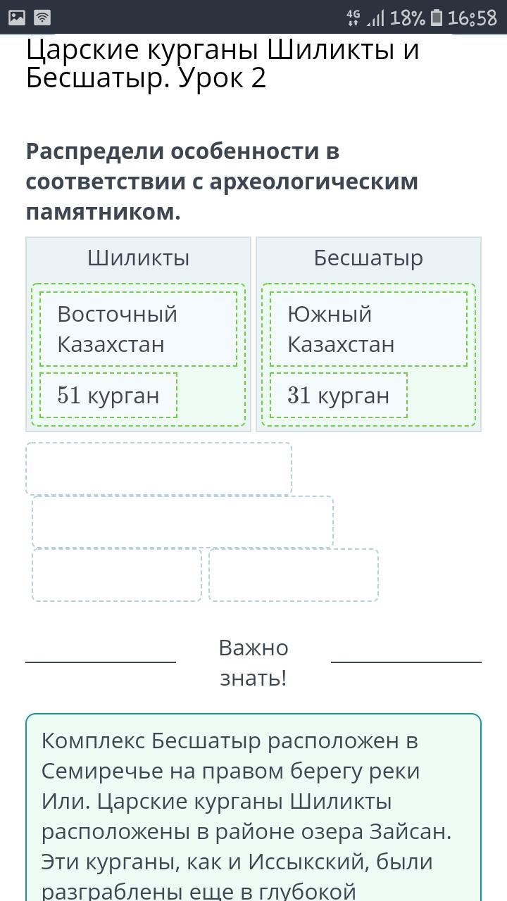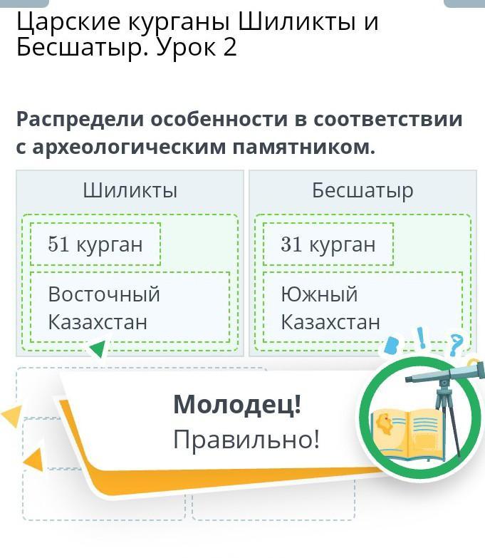 Царские курганы Шиликты и Бесшатыр. Урок 2 Распредели особенности в соответствии с археологическим памятником. Шиликты Бесшатыр