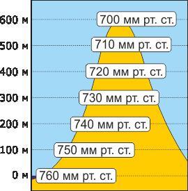 Атмосферное давление уменьшается на 10 мм. рт. ст. на каждые 100 м подъёма.
