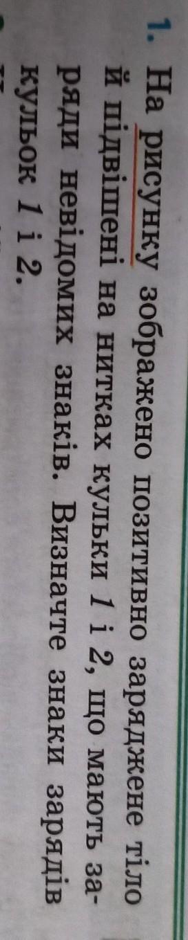 на рисунку зображено позитивно заряджене тіло й підвішені на нитках кульки 1 і 2, що мають заряди невідомих знаків. Визначте знаки зарядів кульок 1 і 2.
