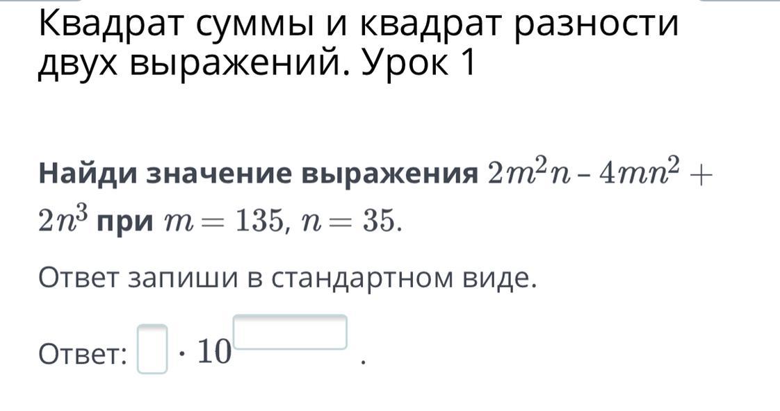 Найди значение выражения 2m?n – 4mn? + 2n3 при т = 135, п= 35.