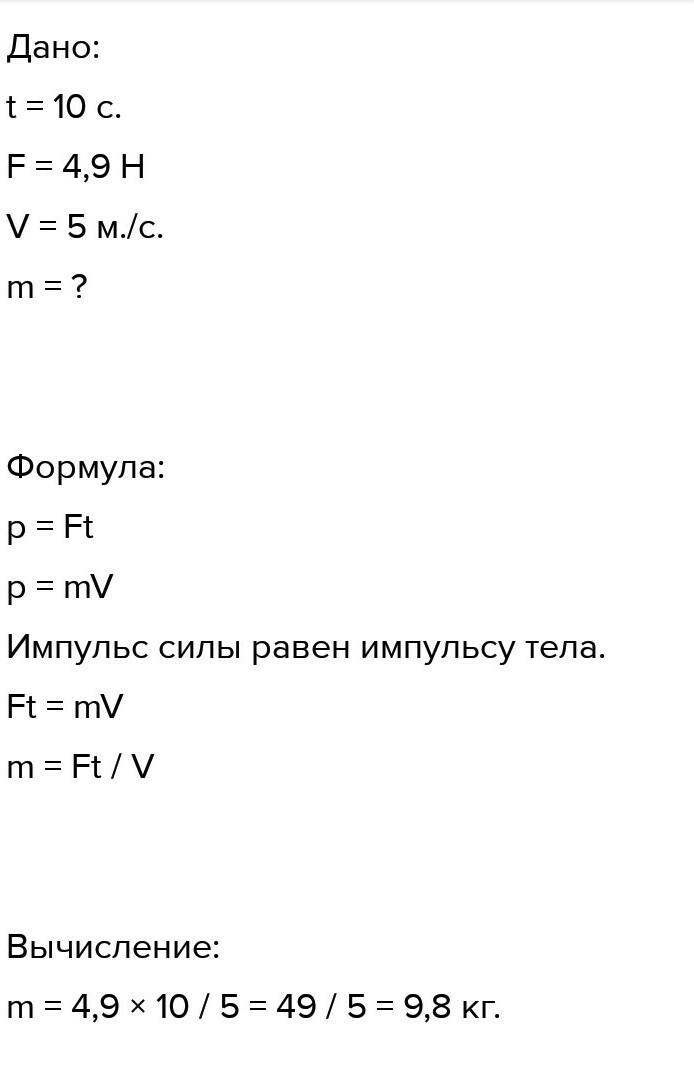 t=10c F=4,9 Н v=5м/с m=?
