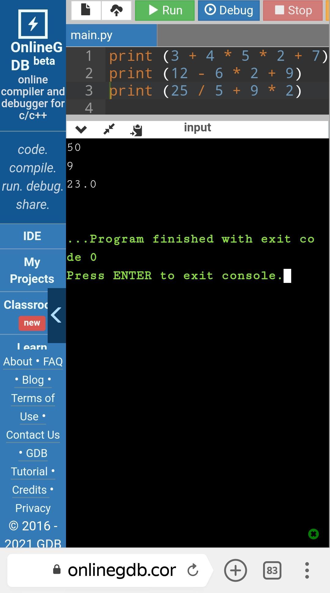 a, b, c = 3+4*5*2+7, 12-6*2+9, 25/5+9*2