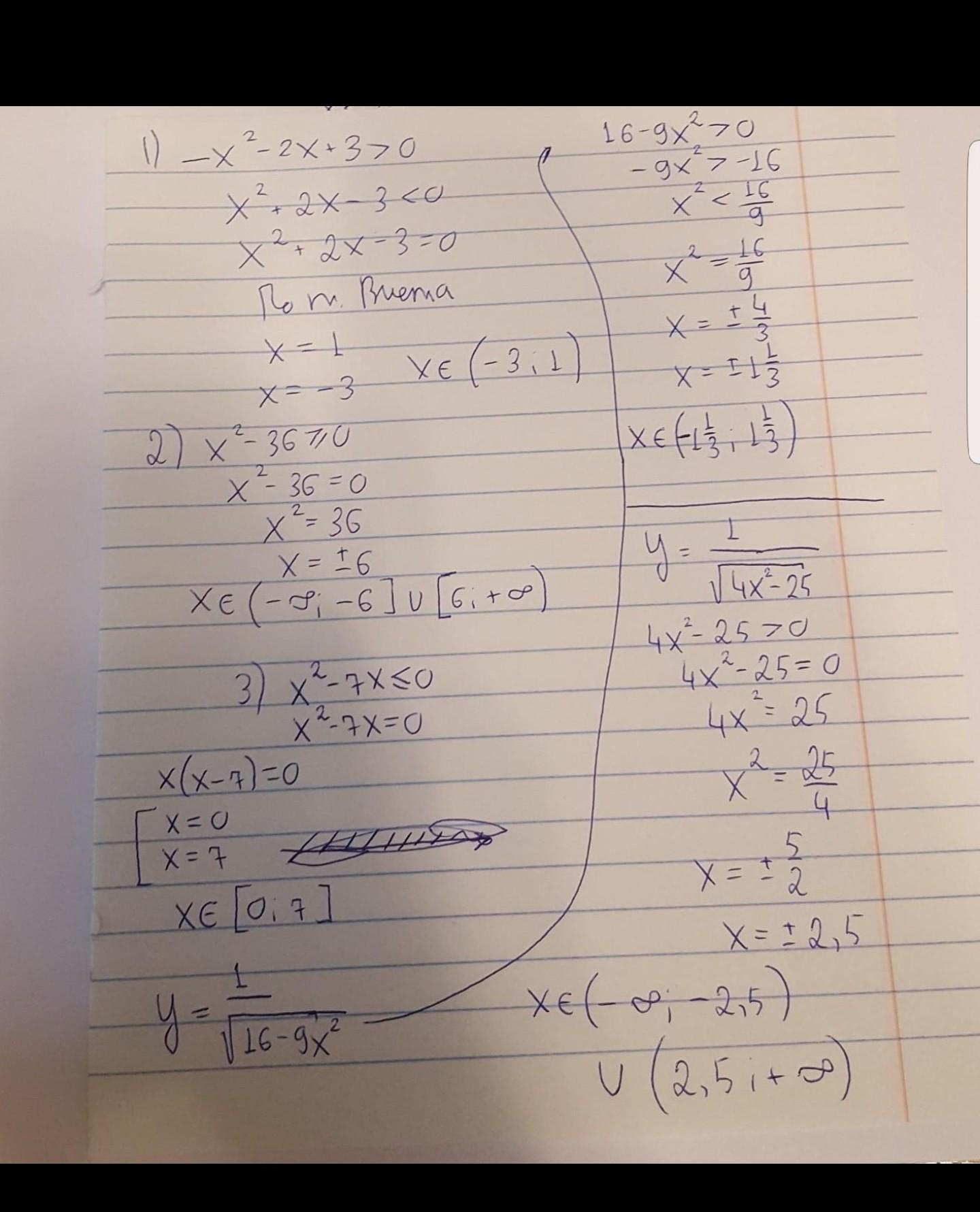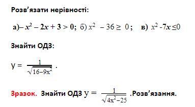 а)– х2 – 2х + 3 > 0; б) x2 -36 ≥ 0; в) x2-7х≤0