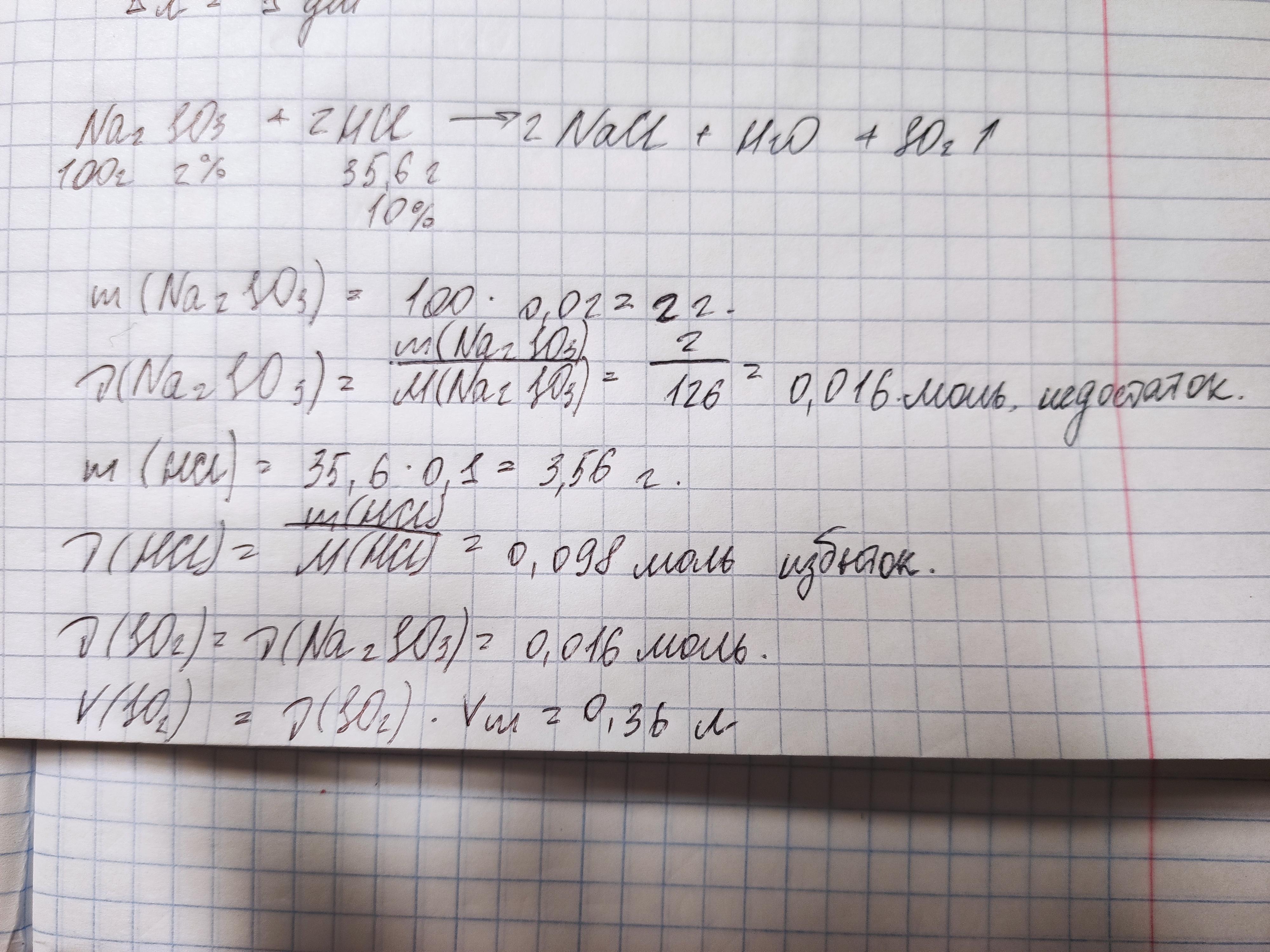Найти объём сернистого газа, который выделяется при взаимодействии 100 г 2% сульфита натрия с 35,6 г 10% раствором соляной кислоты при (н.у)