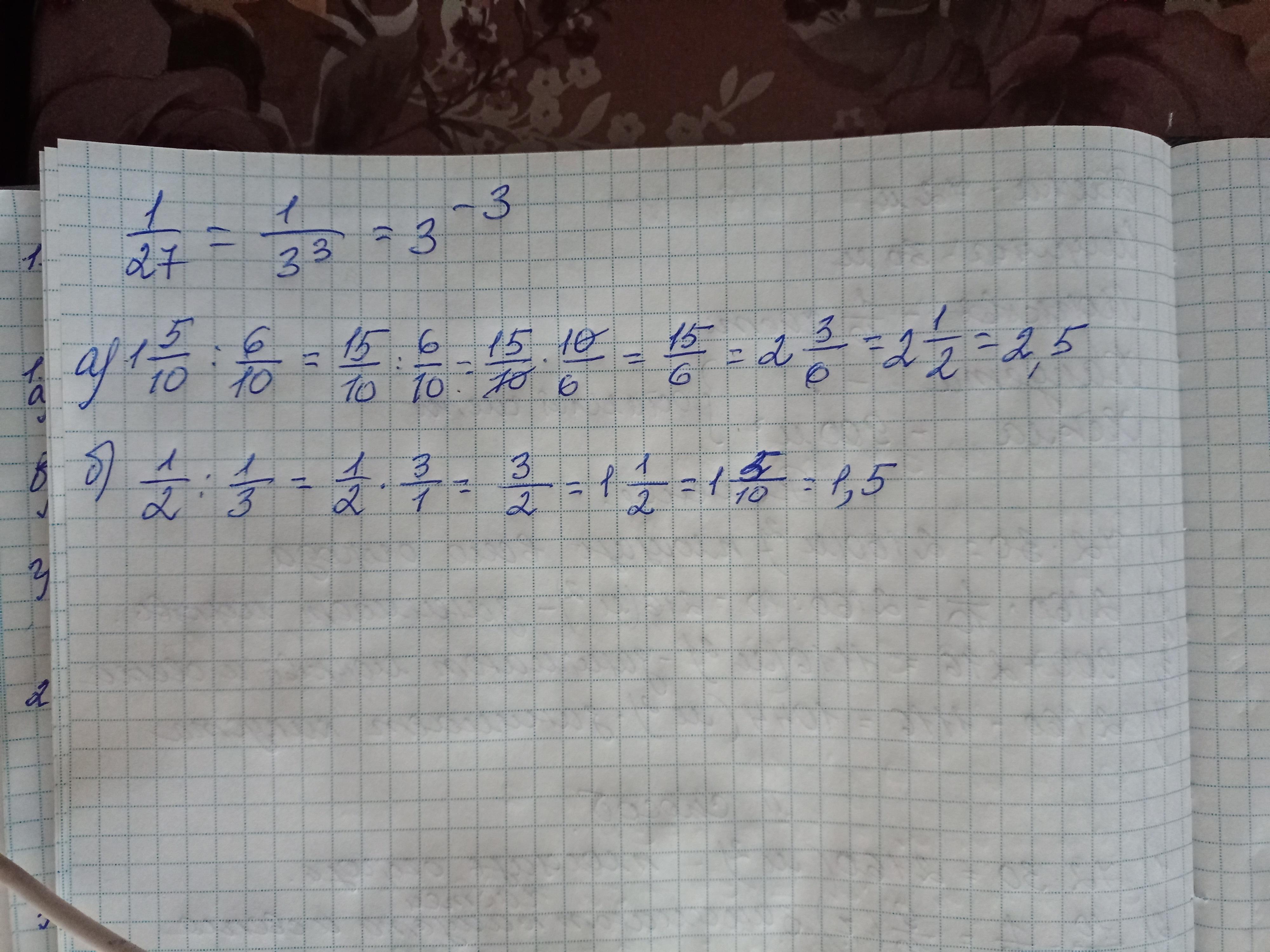 в) 1/2 :1/3 = 1/2 • 3/1 = 3/2 = 1,5.