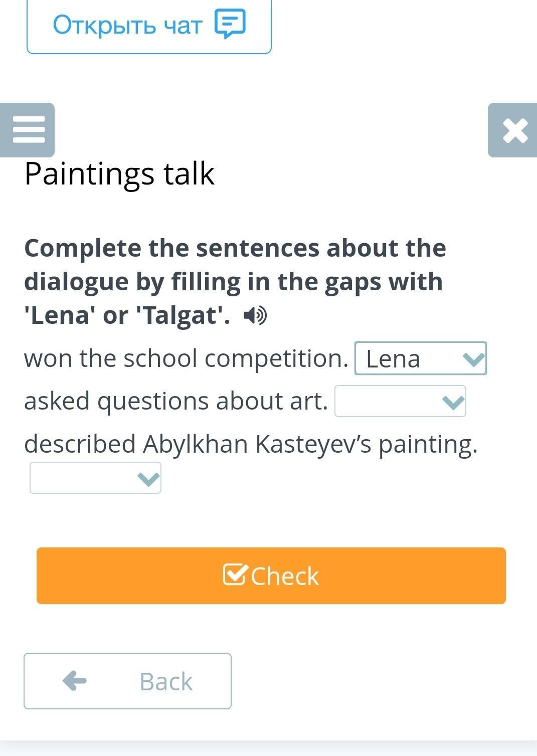 Complete the sentences about the dialogue by filling in the gaps with 'Lena' or 'Talgat