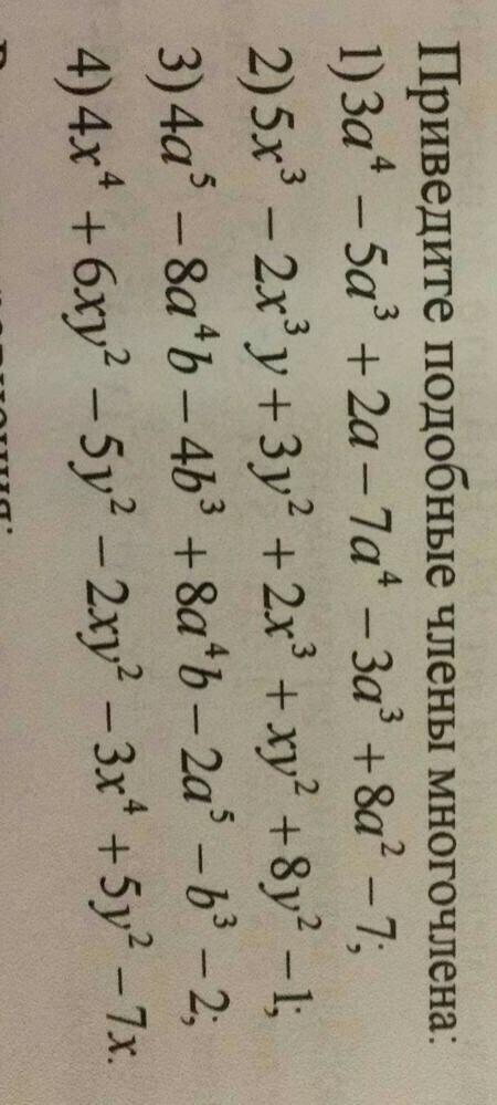 Мы ищем подобные одночлены.Их можно определить по одинаковой степени и по ху приведём приме:6ху^2-4xy^2-они являются подобными и чтобы их сократить мы 6-2=4 и у нас получается 4xy^2,так же чтобы показать что они подобны мы подчеркиваем их линией (можно 1 или 2,а можно волнистой линией,это зависит от количесва подобных членов во многочлене) (надеюсь помогла и надеюсь что правильно)