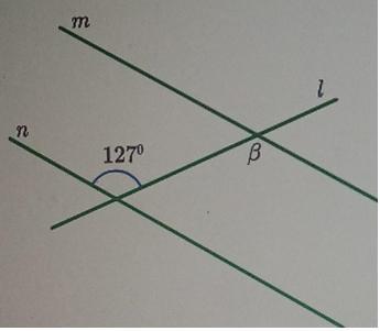 Угол β и угол, равный 127°, - накрест лежащие при пересечении прямых m и n секущей l.