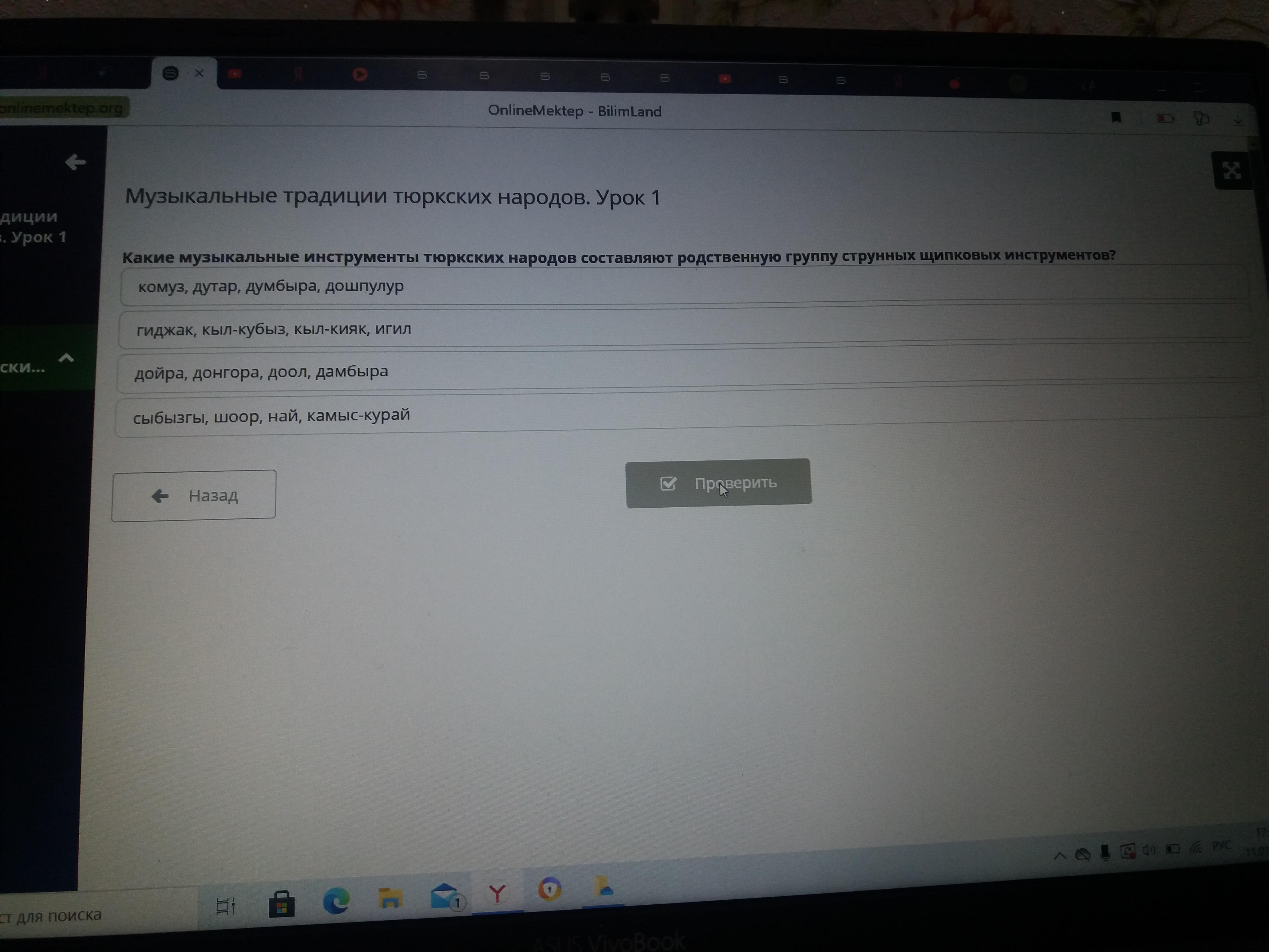 Ответ: Кому́з, Дута́р ,Думбыра́ ,Дошпулур