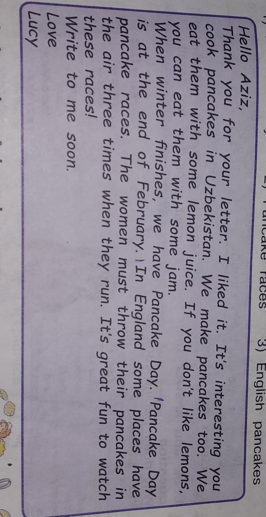 Привет Азиз, Спасибо за письмо. Мне нравится. Интересно, что вы готовите блины в Узбекистане. Блины тоже делаем. Едим их с лимонным соком. Если вы не любите лимоны, можете съесть их с джемом. Когда заканчивается зима, у нас Масленица. «Масленица - в конце февраля. В Англии кое-где устраивают блинные гонки. На беге женщины должны трижды подбросить блины в воздух. Смотреть эти гонки очень весело! Напишите мне в ближайшее время. Люблю Люси