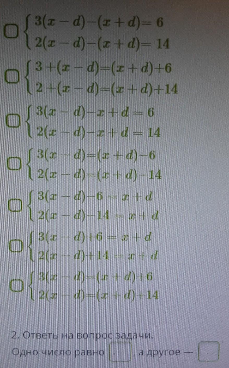 Найди два числа, если известно, что утроенная разность этих чисел на 6 больше их суммы, а удвоенная разность этих чисел на 14 больше их суммы.