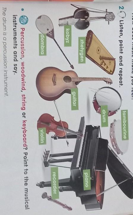 percussion ,woodwind,string or keyboard? point to the musical instruments and say.