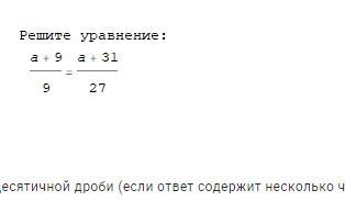 \frac{a + 9}{9}  =  \frac{a + 31}{27}  \\ 27(a + 9) = 9(a + 31) \\ 27a + 243 = 9a + 279 \\ 27a - 9a = 279 - 243 \\ 18a = 36 \\ a = 2
