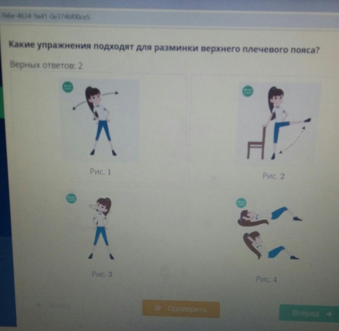 Первый и третий. Даже если проверять данные упражнения на себе, то с помощью рисунка два - разминка ног, а четвертый - это пресс. Плечи хоть как-то задействованы в первом и третьем рисунках.