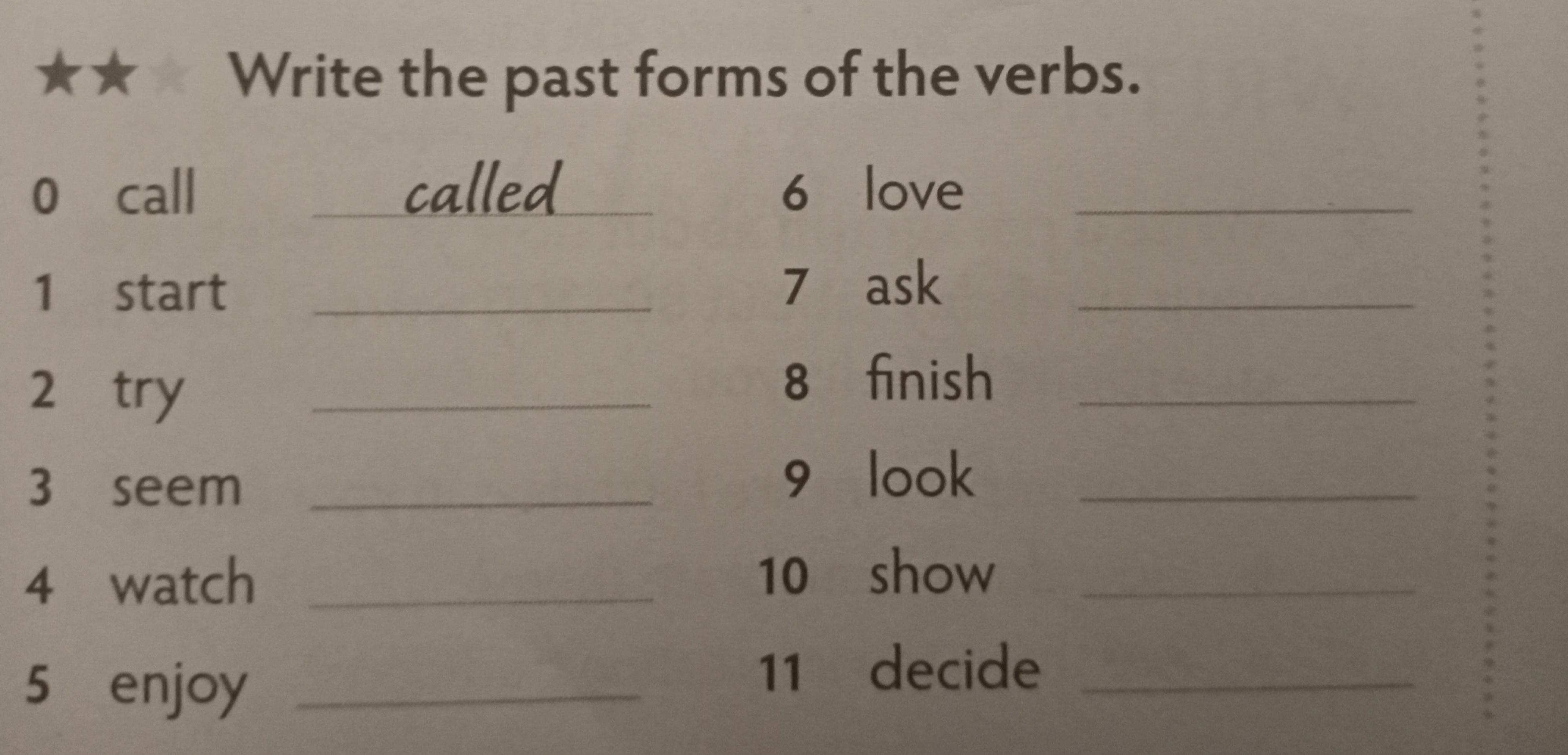 1) started 2) tried 3) seemed 4) watched 5) enjoyed 6) loved 7) asked 8) finished 9) looked 10) showed 11) decided