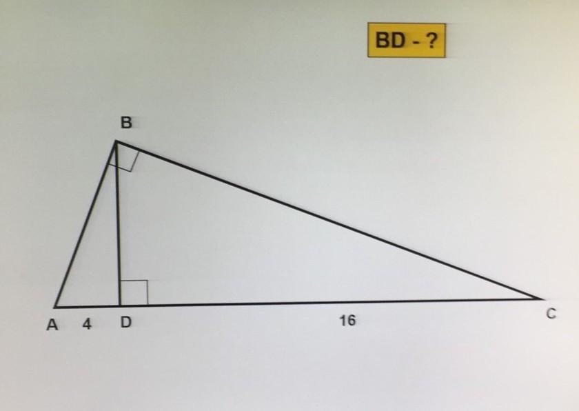 BD² = AD×DC = 4 (ед)×16 (ед) = 64 (ед²)⇒BD = √64 (ед²) = 8 (ед).