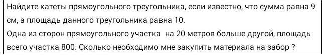 2) пусть одна сторона а=х, другая в=х+20 S=800, S=a*b,
