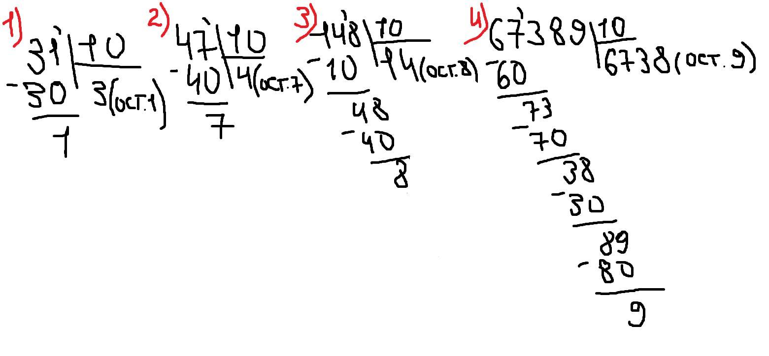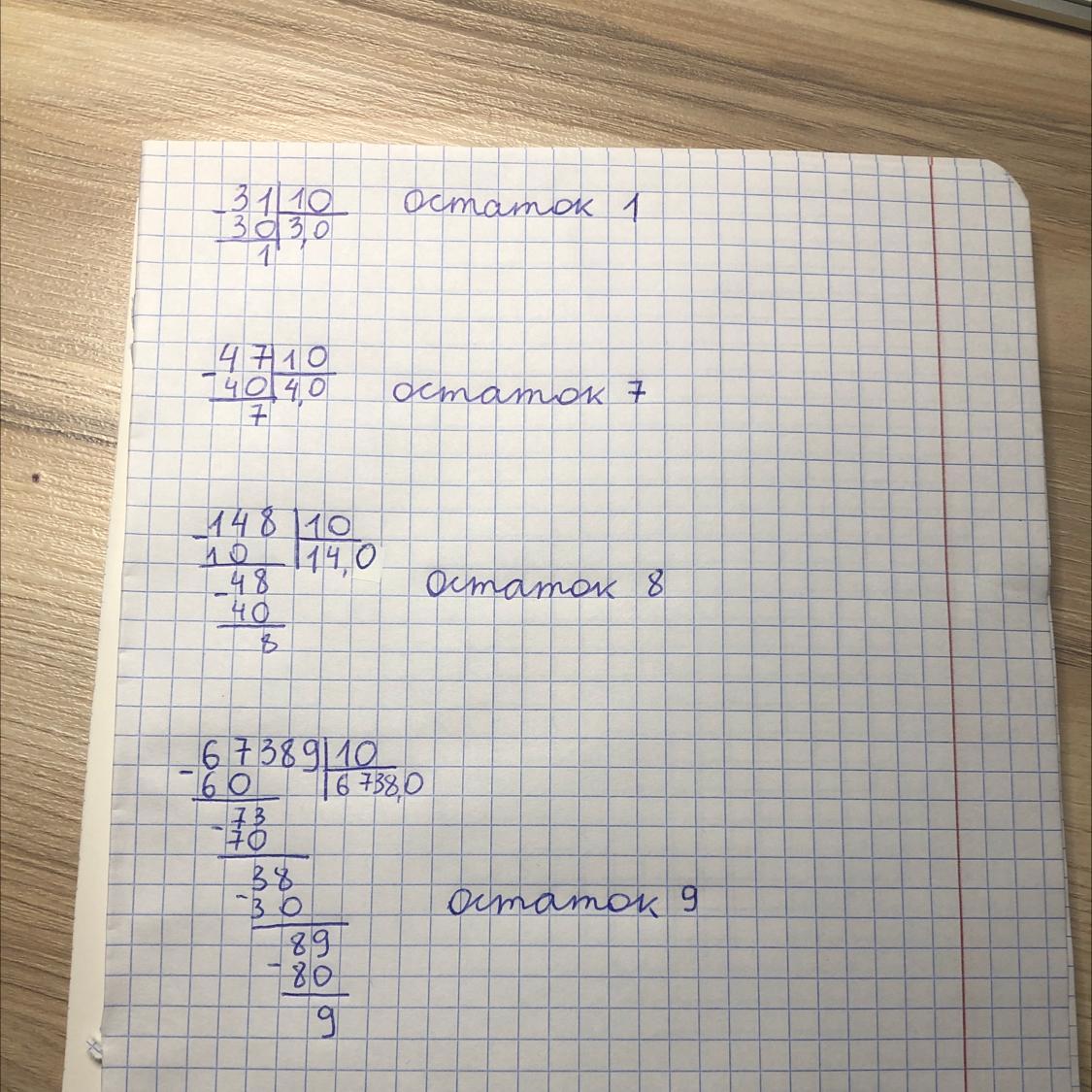 Деление с остатком . Все числа поделить на 10 . Столбиком пожалуйста .