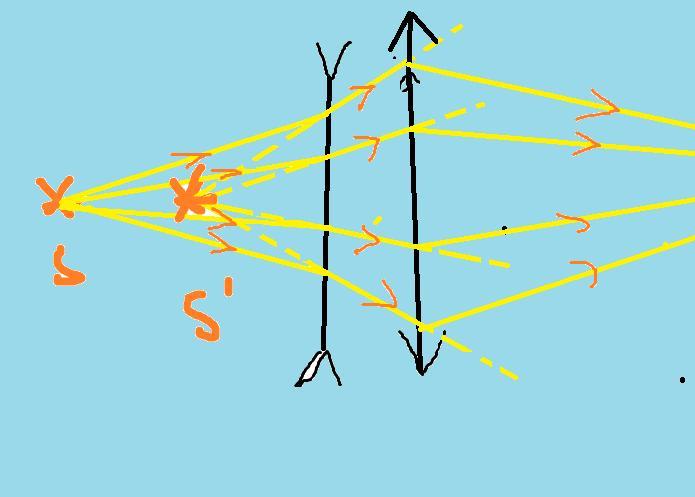 Источник всегда действительный. Другое дело его изображение может быть действительным или мнимым. Действительное изображение то, которое можно увидеть на экране (лист бумаги, матовое стекло и т.д.). Мнимое Вы никогда на экране не увидите. Возьмем рассеивающую линзу. Что значит она строит мнимое изображение? это означает, что линзой мы изменили ход лучей, но глаз (как оптический прибор с одной собирающей линзой) построил действительное изображение на сетчатке. Я не буду вдаваться в тонкости хода лучей, но мы получили на сетчатке прямое уменьшенное действительное изображение. Теперь просто вместо глаза поставте свою собирающую линзу. Вы получите тоже самое. Размеры действительного изображения будут зависить от диоптрийных сил этих двух линз и расстояний между ними. Если предположим на Вашем рисунке рассеивающая линза будет -10д, а собирающая +1д, то лучи так и будут расходиться и действительного изображения вообще не будет, будет только мнимое. В такой ситуации линзы нужно рассматривать совместно. Если между линзами есть расстояние, то геометрический ход лучей надо строить по всем правилам сначала для рассеивающей линзы и затем для собирающей.