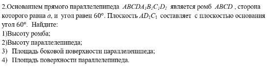Основанием прямого параллелепипеда ABCDA1B1C1D1 является ромб АВСD, сторона которого равна а и угол равен 60°. Плоскость АD1C1 составляет с плоскостью основания угол 60°.