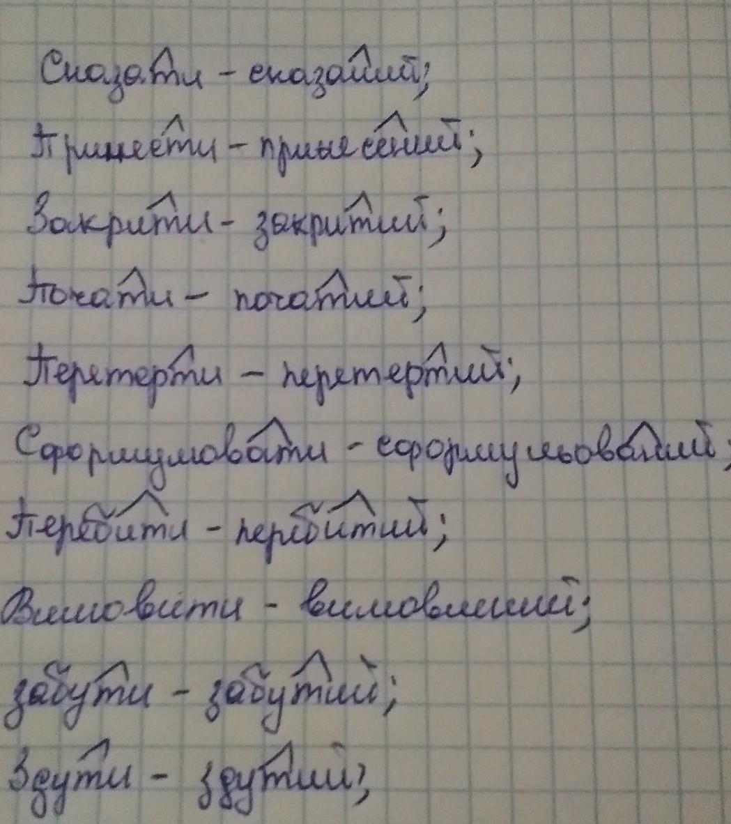 сказати-сказаний , принести- принесений , закрити- закритий, почати-початий, перетерти-перетертий, сформулювати-сформульований,перебити-перебитий, вимовити-вимовлений,забути- забутий,здути-здутий.