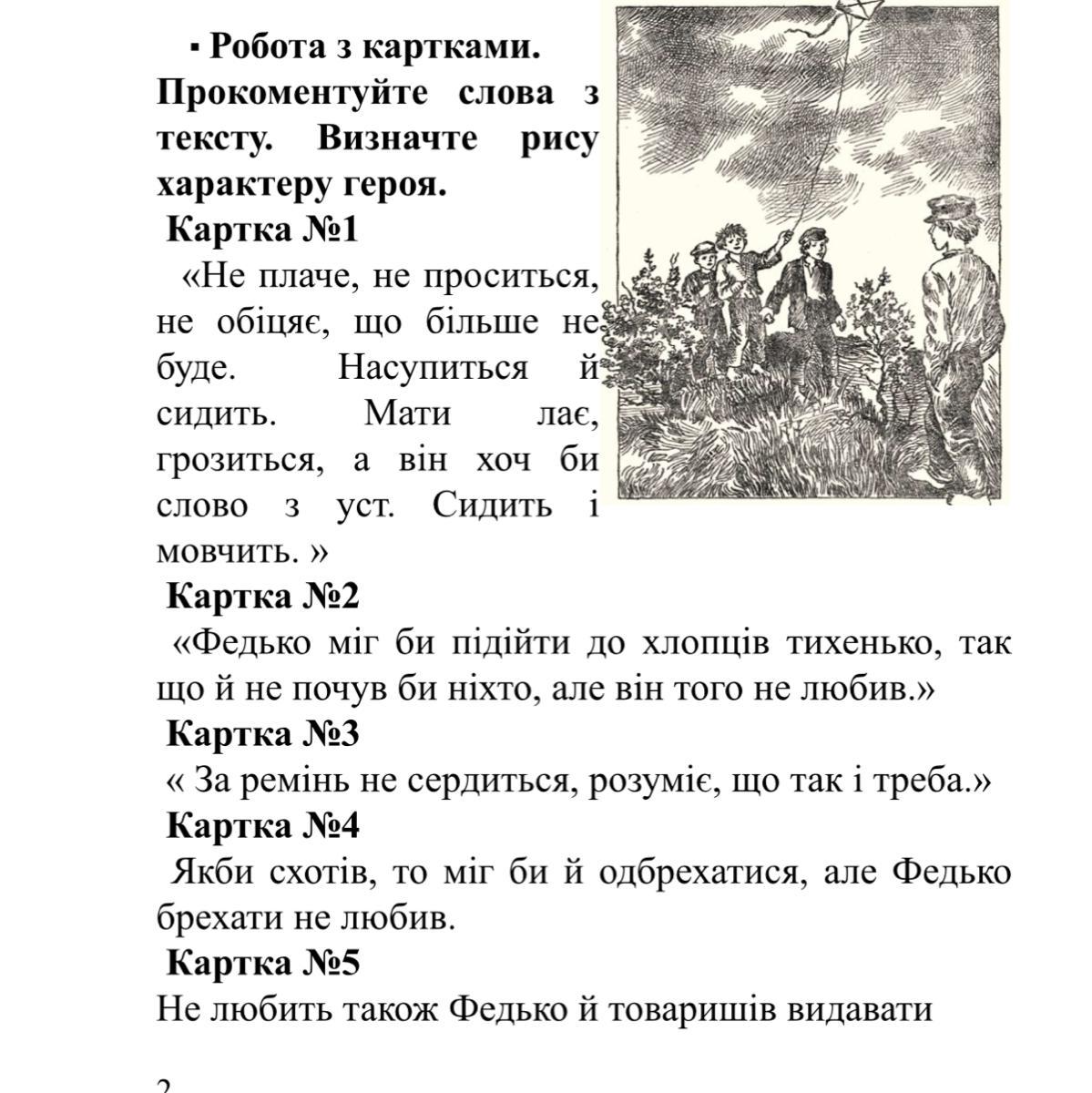 1.1. Федько — син бідного робітника друкарні. 1.2. Портретна характеристика Федька. («…розбишака-халамидник», «наче біс який сидів у хлопцеві», «сибіряка» і «люципер». «…Чуб йому стирчком виліз з-під картуза, очі хутко бігають», «руки в кишені, картуз набакир, іде, не поспішає»).