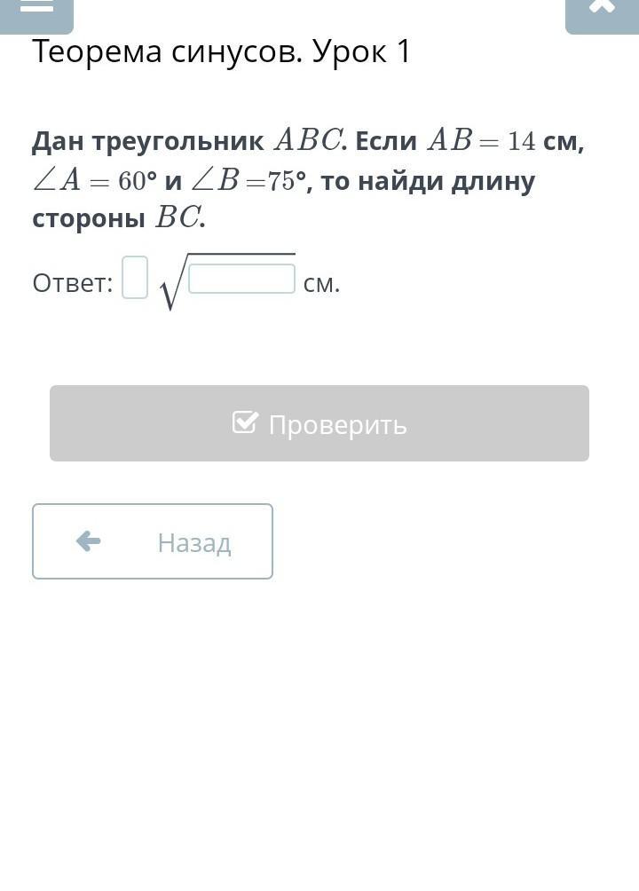 Дан треугольник ABC. Если AB = 14 см, ∠A = 60° и ∠B =75°, то найди длину стороны BC.